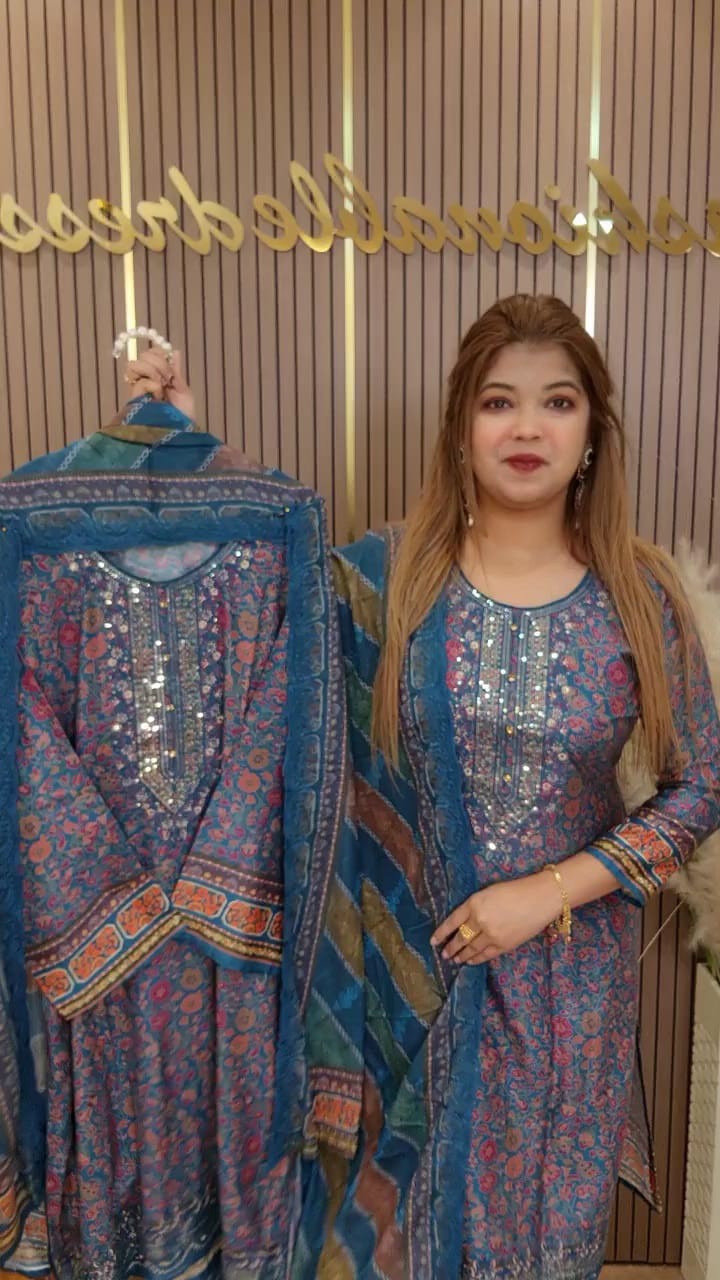 Digital print with embroidery sequence work